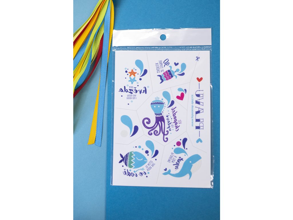 Dětské tetování na jedno použití. Obtisky mají krásné motivy, které byli navrženy speciálně pro Plaváček a nejsou nikde jinde k dispozici. Arch obsahuje 8 obrázků. Velikost archu je cca 10,6 cm x 15 cm.